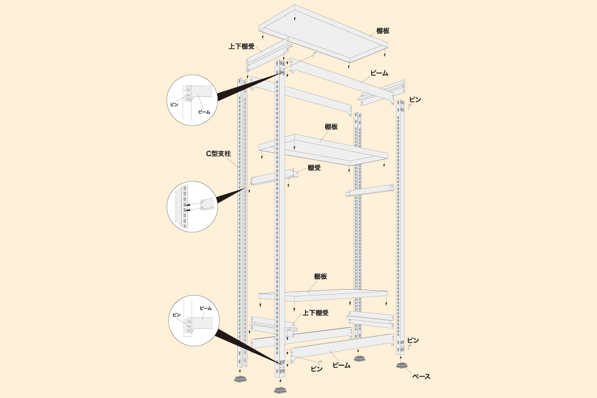 支柱と天板の取り付けで、ボトルは使用しません。従来のスチール棚に比べ、時短で組み立て・解体が可能です。